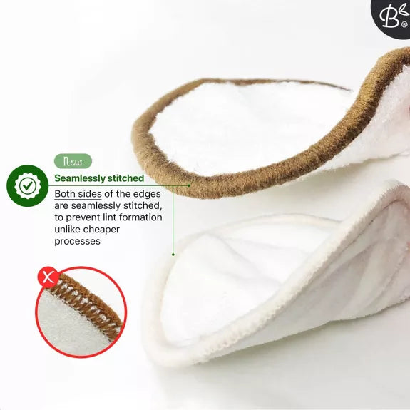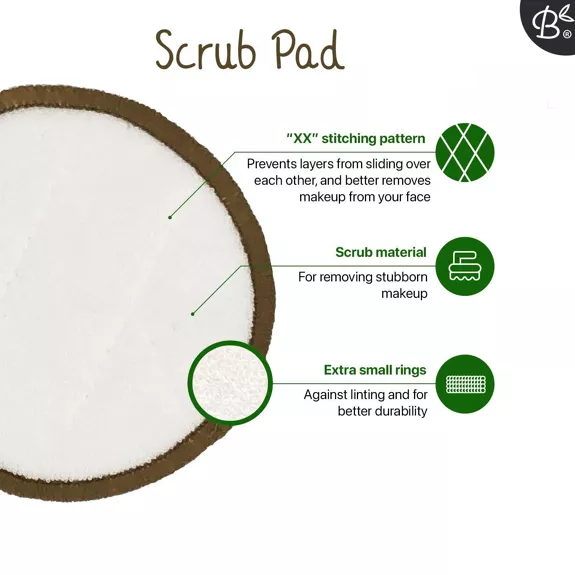 Dankzij de 2-laagse structuur absorberen de schijfjes minder lotion en behouden ze beter hun vorm. Het stikselpatroon zorgt ervoor dat de schijfjes niet over elkaar schuiven en helpt make-up net iets beter te verwijderen. De scrubschijfjes worden bovendien gemaakt met kleinere lussen, waardoor ze minder snel blijven haken, pluizen en langer meegaan.