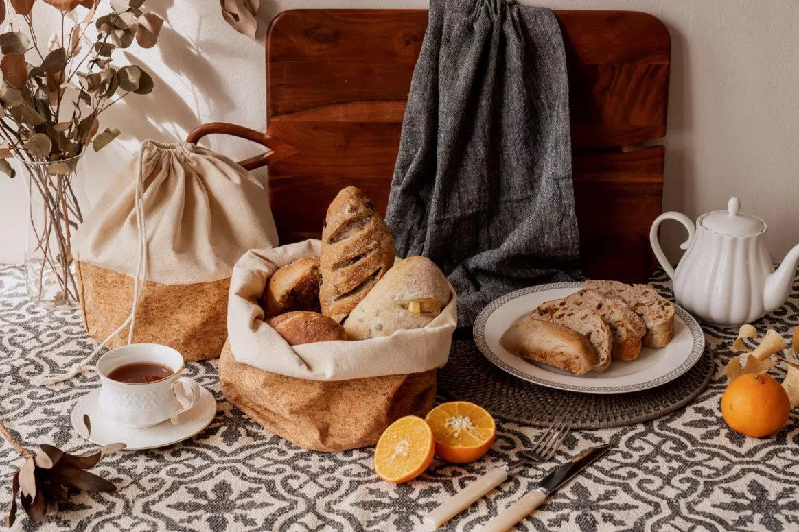 Deze veelzijdige broodzak en broodmand gemaakt van biologisch katoen en kurk staat niet alleen prachtig in uw keuken, het houdt ook brood en andere producten vers en kan worden omgevormd van bewaarzak tot presenteermand!